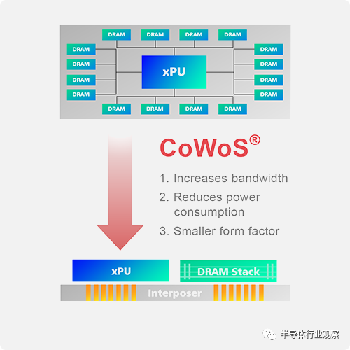 目前為人所熟知的2.5D 封裝技術(shù),不外乎是臺積電的CoWoS。CoWoS 技術(shù)概念,簡單來說是先將半導(dǎo)體芯片(像是處理器、記憶體等),一同放在硅中介層上,再透過Chip on Wafer(CoW)的封裝制程連接至底層基板上。換言之,也就是先將芯片通過Chip on Wafer(CoW)的封裝制程連接至硅晶圓,再把CoW 芯片與基板連接,整合成CoWoS;利用這種封裝模式,使得多顆芯片可以封裝到一起,透過Si Interposer 互聯(lián),達(dá)到了封裝體積小,功耗低,引腳少的效果。