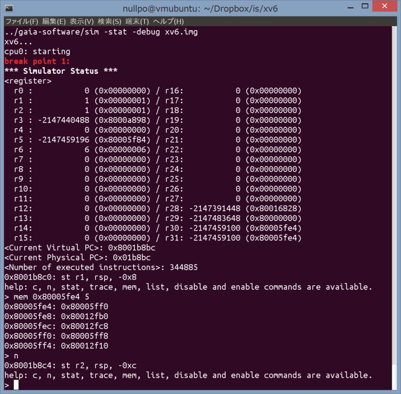 Masayoshi 開始為我們的 CPU 實(shí)現(xiàn)真正的初始化,而不只是將引導(dǎo)順序注釋掉;而 Shohei 將 Xv6 的 x86 匯編重寫進(jìn)了我們自制的架構(gòu)中。我為我們的模擬器添加了中斷模擬,而這個(gè)模擬器是 Wataru 在 CPU 實(shí)驗(yàn)的核心任務(wù)部分開發(fā)的;另外我還完成了對(duì)虛擬地址轉(zhuǎn)譯的支持。這能讓模擬器有足夠的功能來運(yùn)行 OS。